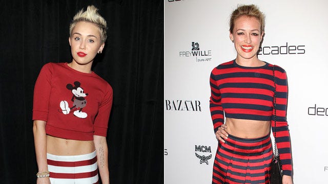 If you got it, flaunt it! Both Miley Cyrus and So You Think You Can Dance host Cat Deeley showed off their amazing abs recently, Miley in a popular Marc Jacobs Mickey Mouse sweater at the Marc Jacobs Collection Fall 2013 fashion show on Valentine's Day, and Cat in a red-and-black striped ensemble at the Harper's Bazaar launch for the Dukes of Melrose on February 28, 2013.