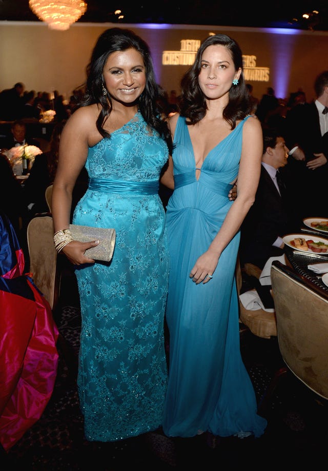 The Mindy Project star Mindy Kaling and Newsroom's Olivia Munn made similar style choices when they stepped out for the 2014 Costume Designers Guild Awards on Feb. 22, 2014 in Beverly Hills, Calif. Kaling is wearing a custom Salvador Perez gown, while Munn's is sporting a J. Mendel gown. Are you liking this shade of blue?