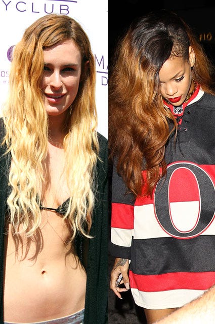 Forget about the ombre trend -- stars like Rumer Willis and Rihanna are taking it to the next level, sporting three-toned hair. Willis debuted her mermaid-like 'do, which goes from brunette roots to platinum blonde tips, at the Marquee Dayclub on April 6, 2013, while Rihanna let her colorful hair down at the Greystone Manor in Hollywood, Calif. on April 8, 2013.