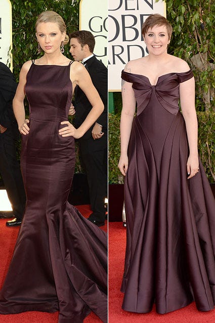 Taylor Swift's Donna Karan Atelier dress was the exact raisin shade as Golden Globe winner Lena Dunham's Zac Posen getup on Sunday, Jan. 13, 2013.