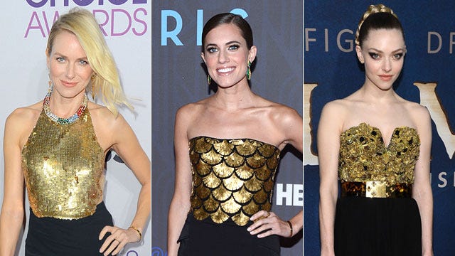 The dramatic color combination of gold and black is quickly becoming a mainstay on the red carpet. Naomi Watts stunned in a slinky Alexander McQueen number at Wednesday night's People's Choice Awards, while Allison Williams also had the trend in mind at Wednesday's Girls premiere in New York City, sporting a gold Altuzarra top and a matching black skirt. But Amanda Seyfried was first to take a stab at the bold color combo in December, sporting a jaw-dropping Alexander McQueen gown at the Les Miserables premiere in New York City.