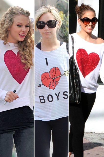 Celebs are wearing their hearts on their tees! Jennifer Lopez, Ashley Tisdale and Jennifer Lopez have all been spotted adding hearts to their street style.