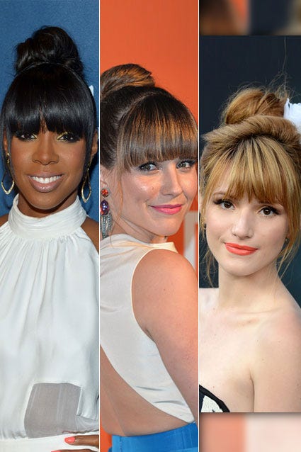 Kelly Rowland sported a high bun with bangs at the 24th Annual GLAAD Media Awards on April 20, 2013, a daring 'do that Sophia Bush owned at a Coach event on April 10 and Disney trendsetter Bella Thorne sported at The Host premiere on March 19.