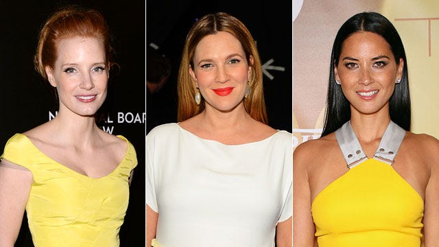 Jessica Chastain was a breath of fresh air in a bright yellow Oscar de la Renta dress at the 2014 National Board of Review Gala in New York City on January 7, while Drew Barrymore dressed up her baby bump in a cute white-and-yellow Vionnet dress at the People's Choice Awards on January 8 in Los Angeles. Finally, Olivia Munn sported the hot hue with this Victoria Beckham halter dress at Variety's Breakthrough of the Year Awards on January 9 in Las Vegas.