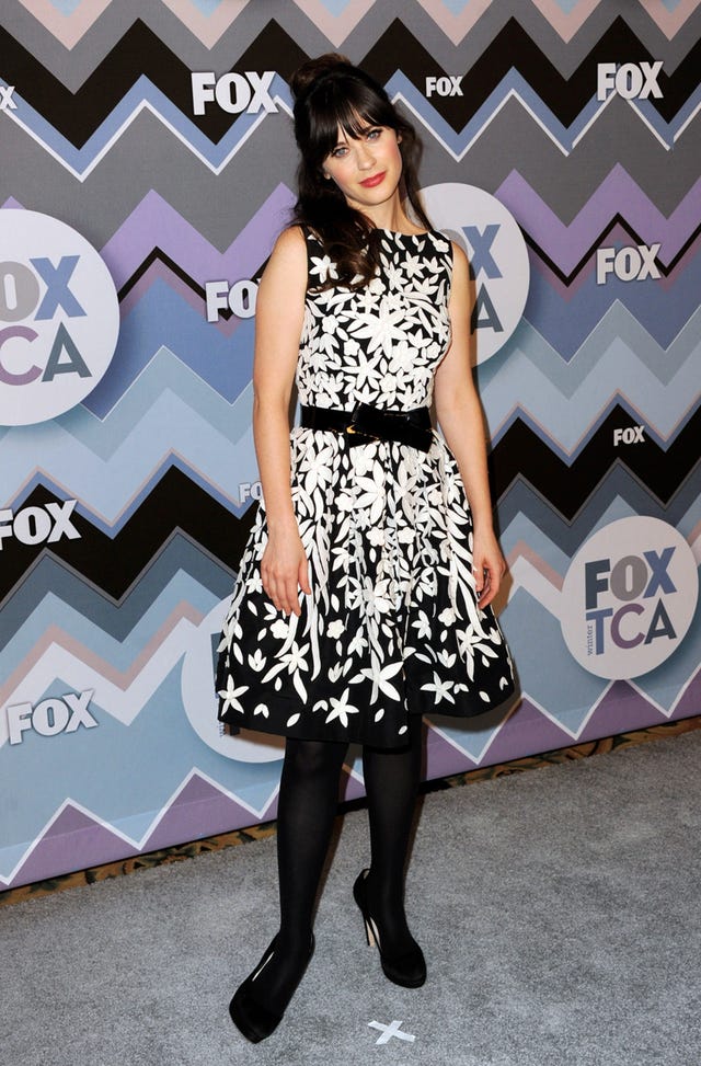 Zooey Deschanel did her usual cutesy pose on the red carpet, donning a pretty Naeem Khan black and white dress.
