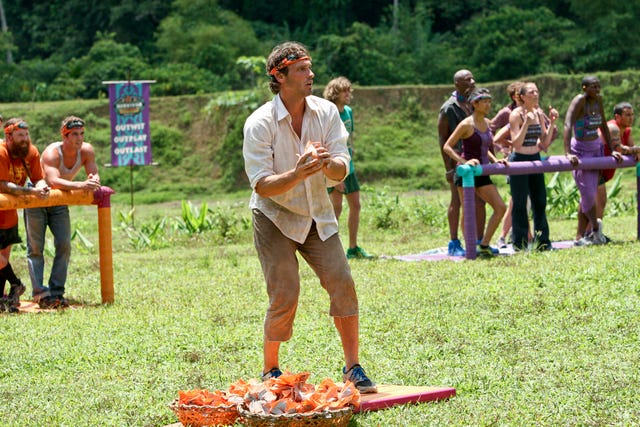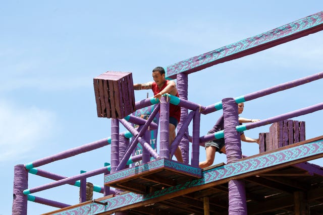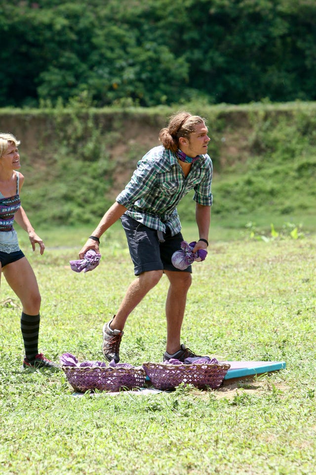 Malcolm Freberg, not having gotten much of a break after making the top three in Survivor: Philippines last season, winds up for an underhand toss of what appears to be a purple sandbag.