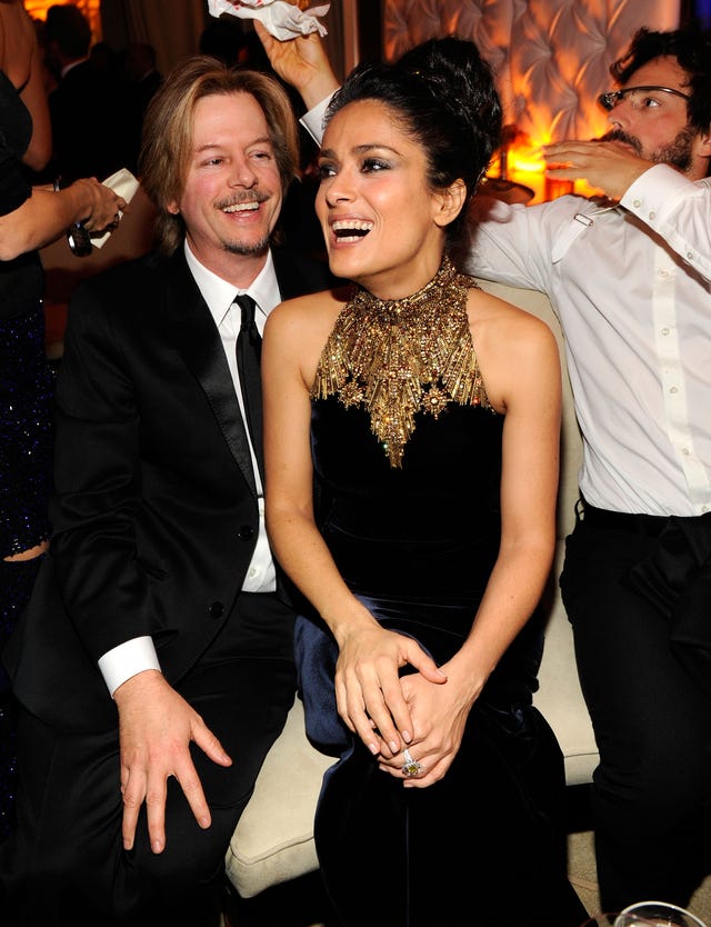 David Spade and Salma Hayek share a laugh at last night's 2013 Vanity Fair Oscar Party the at the Sunset Tower Hotel in Hollywood.