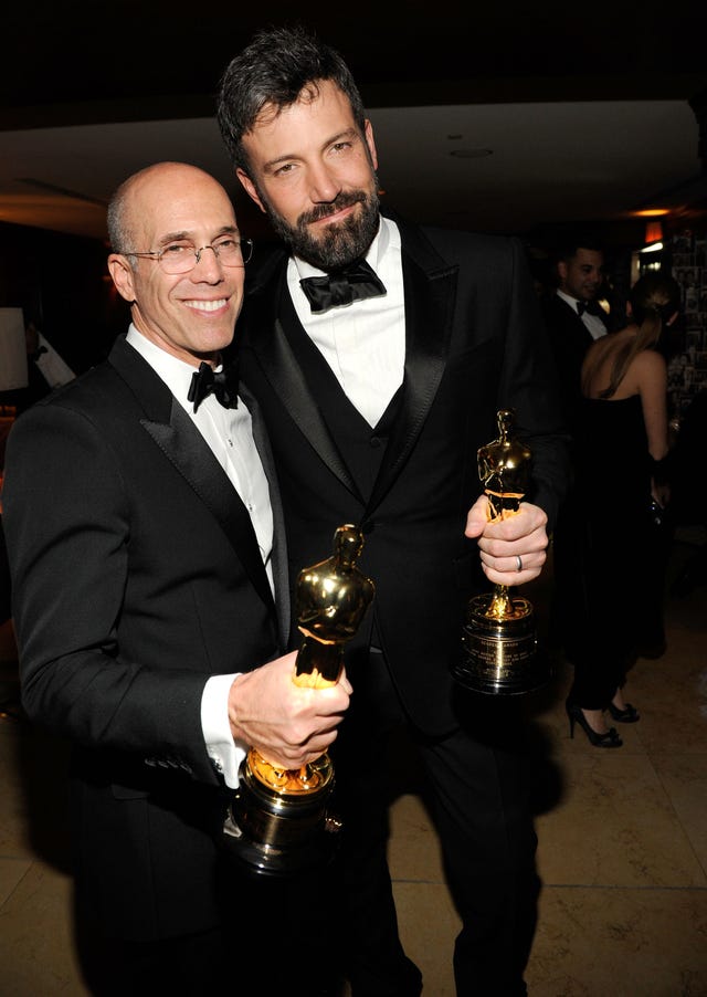 Jeffrey Katzenberg and Ben Affleck pose with their Oscars at last night's 2013 Vanity Fair Oscar Party the at the Sunset Tower Hotel in Hollywood.