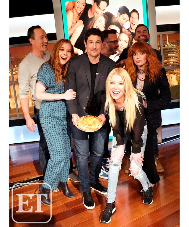 What a high school reunion! ET brought the cast of American Pie -- Jason Biggs (who played fumbling virgin Jim), Chris Klein (Casanova Chris "Oz" Ostreicher"), Tara Reid (girl next door Vicky), Alyson Hannigan (band geek Michelle Flaherty) and Eddie Kaye Thomas (mochaccino-drinking dilettante Paul "Sh*tbreak" Finch) -- back together in one room for the first time since 2012. So where was Shannon Elizabeth? Like art imitating life, the actress who played foreign exchange student Nadia is abroad -- she lives in South Africa, where she works in animal rescue. "We all look pretty good!" Reid announced as she eyed up her castmates gathered in the green room. The teen sex comedy was released in theaters on July 9, 1999. For even more pics from the epic reunion, click here.