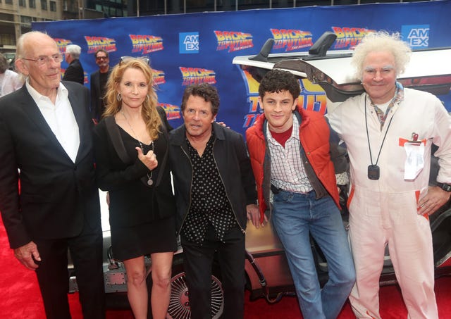 Christopher Lloyd, Lea Thompson, and Michael J. Fox reunited and posed with Broadway stars Casey Likes and Roger Bart at the Michael J. Fox Foundation's opening night gala for Back to the Future: The Musical at The Winter Garden Theatre on July 25, 2023 in New York City.
