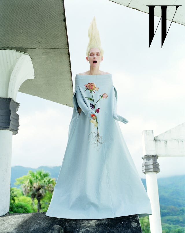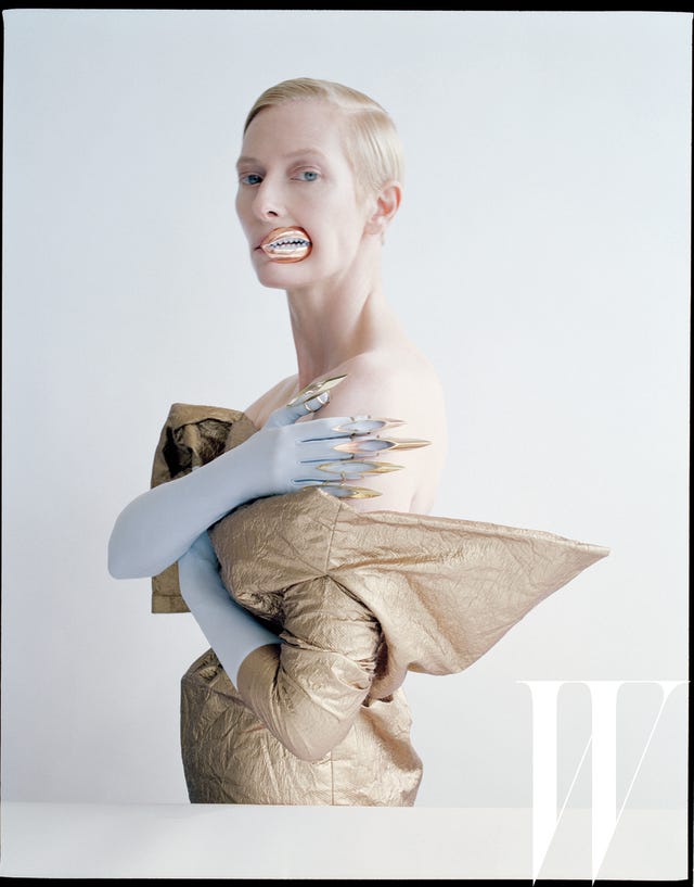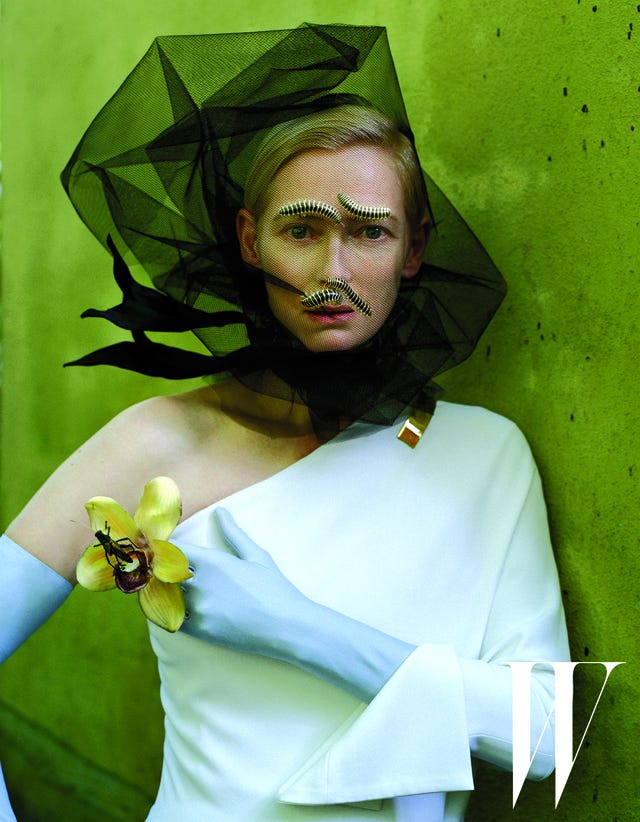 "Being beautiful was never really something I associated with people I knew-- certainly not girls," Swinton tells W. "Boys, maybe. Horses, yes, and certainly my great-grandmother Elsie Swinton, whose imperial grandeur was like a watermark."