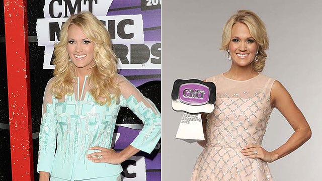 Check out the many outfit changes at the CMT Music Awards, starting with Carrie Underwood, who surprised many on the purple carpet in this Edition by Georges Chakra teal shorts suit. She later changed into a more familiar style for her -- a sparkly pink princess dress.
