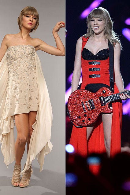 Taylor Swift wore one of her raciest on-stage outfits to date -- a customized red and black corset dress -- to perform her song Red, a big change from her girly strapless Elie Saab dress she wore for the rest of the night.