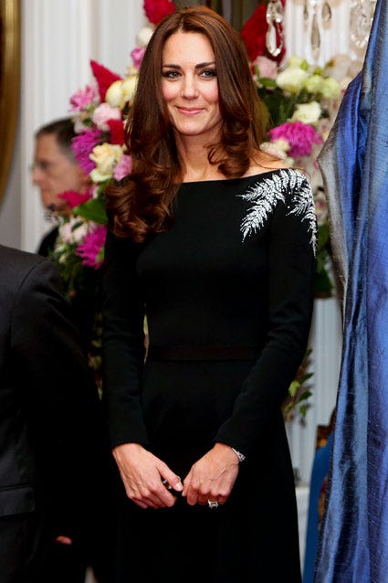 The Duchess of Cambridge stepped out in a formal LBD with an eye-catching shoulder embellishment for a state reception at the Government House on April 10, 2014 in Wellington, New Zealand.