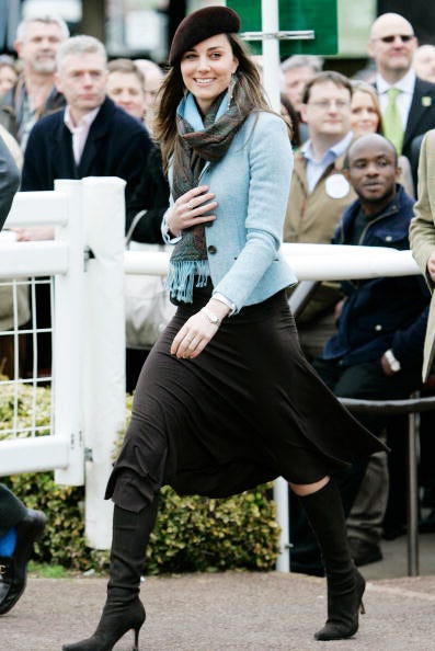 Kate looks carefree in a blue blazer, skirt and high boots as she attends the final day of Cheltenham Festival on March 16, 2007 in Gloucestershire, England.