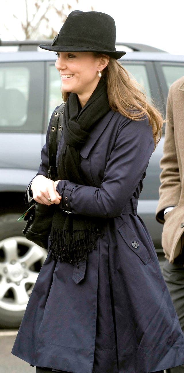 Kate is spotted at Cheltenham Racecourse on March 14, 2008 in England wearing this navy blue trench and black fedora.