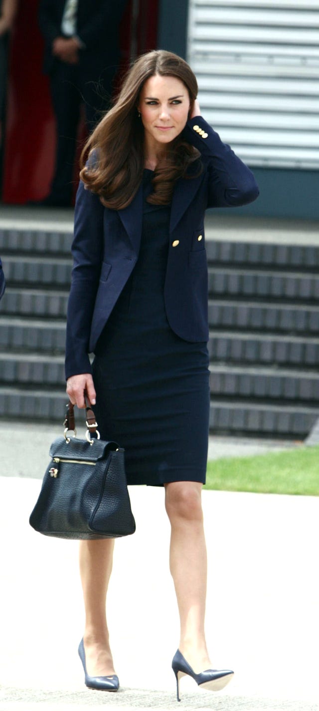 Here she is on June 30 looking beautiful in a navy blue Roland Mouret Manon Dress with a Smythe les Vestes blazer as she boards the plane for her and Prince William's trip to Canada.