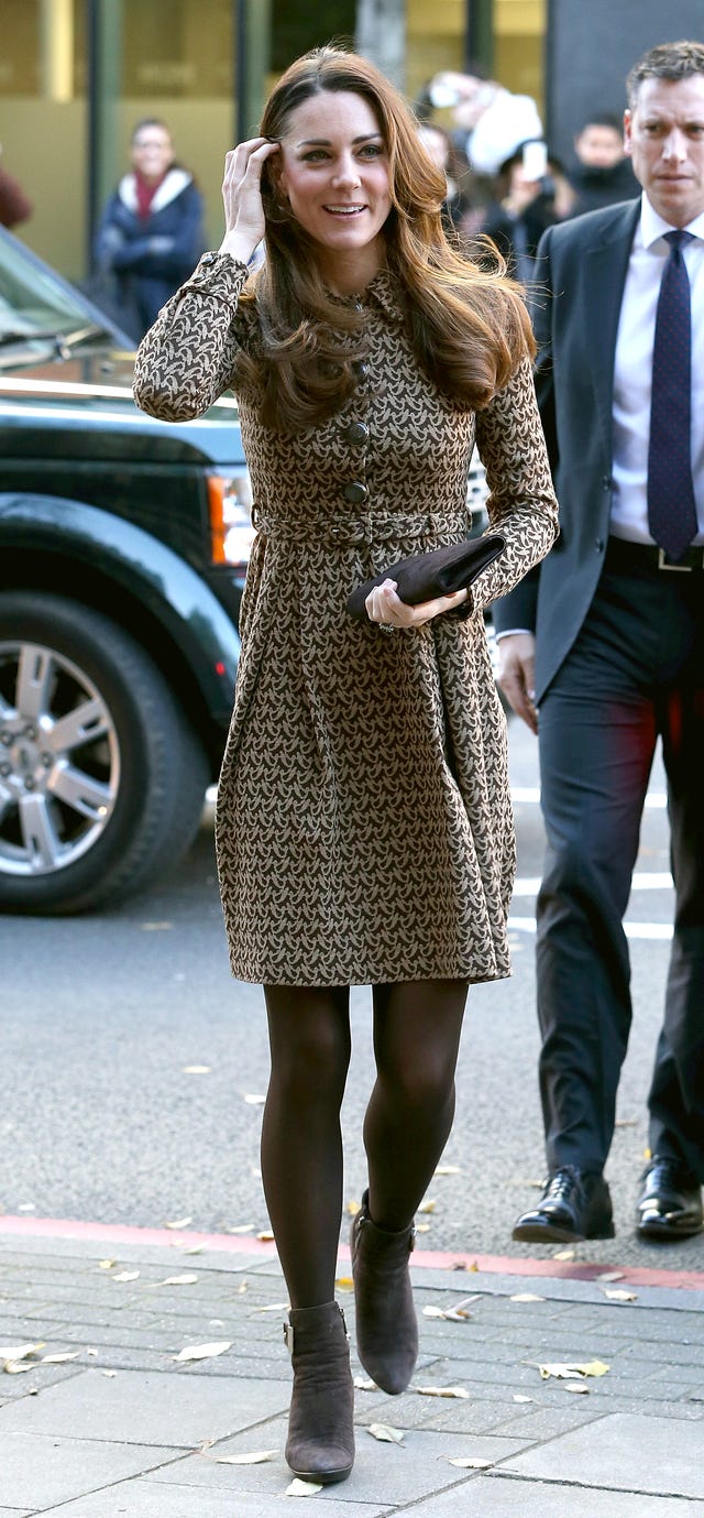 Kate Middleton re-wore her Orla Kiely coat for a trip with her husband Prince William to the London offices of Only Connect, a crime prevention charity and positive community helping prisoners, on Nov. 19, 2013. The duchess paired the style-savvy coat with brown tights, Aquatalia ankle boots and an Emmy clutch.