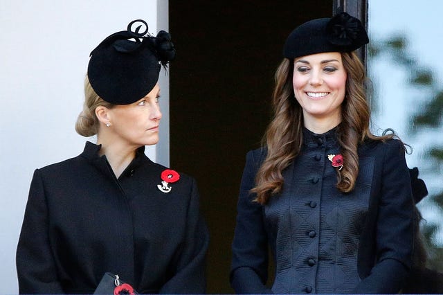 Catherine, Duchess of Cambridge, was all smiles in her matching coat and hat as she stood next to Sophie, Countess of Wessex, as they watched from a balcony a wreath-laying ceremony at the Cenotaph on Whitehall on Nov. 10, 2013 in London.