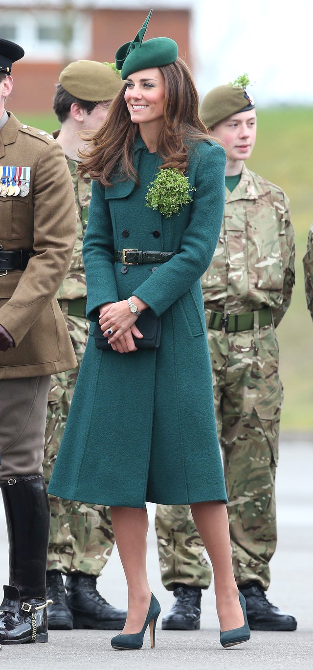 Kate Middleton got into the St. Patrick's Day spirit on March 17, 2014 at the St Patrick's Day parade at Mons Barracks on March 17, 2014 in Aldershot, England, wearing a Hobbs Persephone green coat, hat and matching green heels.