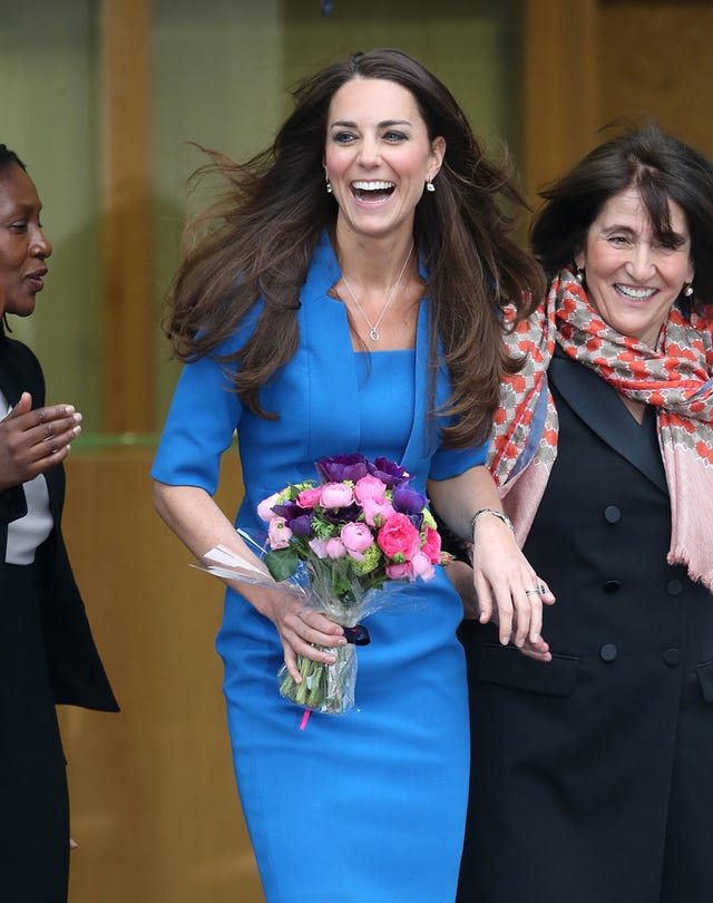 Kate Middleton had a good laugh as she left the opening of the ICAP Art Room at Northolt High School on Friday, February 14, 2014 in Ealing, England. The Duchess of Cambridge held a lovely bouquet of flowers that just so happened to match her eye-catching blue dress.