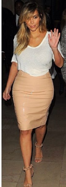 Kim proved she can make even a white tee-shirt look good, looking effortlessly stylish in a pink leather pencil skirt and a loose white tee out and about in Paris.