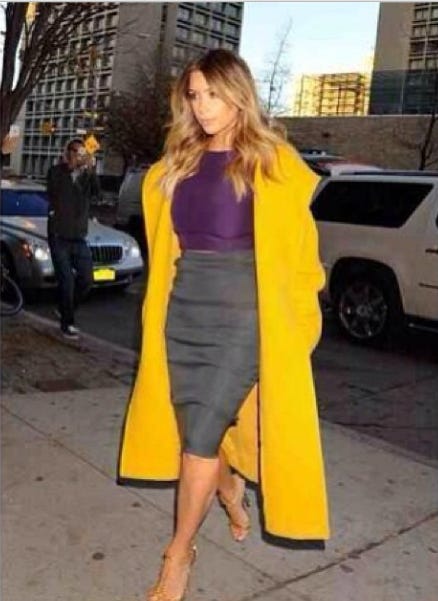 Kim proved just how far she's come along in fashion, expertly mixing colors in this bright yellow Max Mara coat, purple Marni top and gray Lanvin pencil skirt.