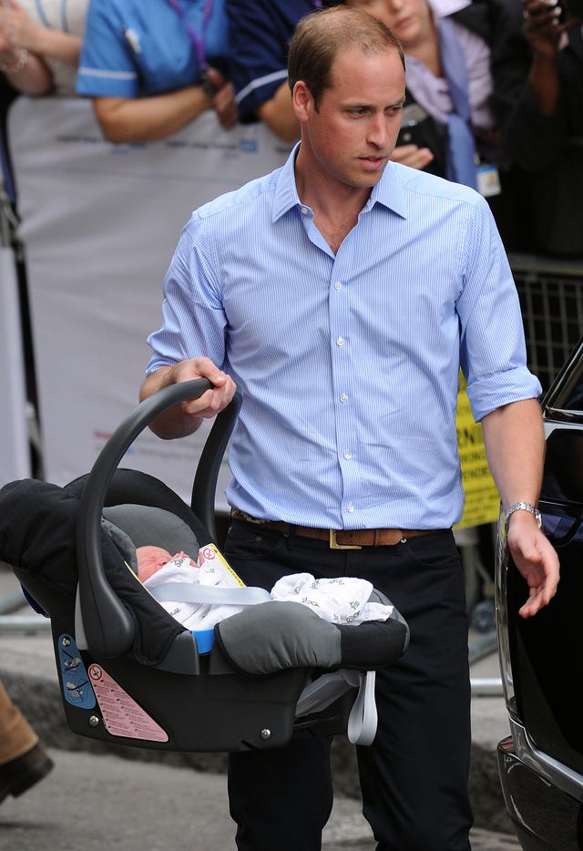 Prince William tucks his son into a car seat before pulling away from St. Mary's Hospital on July 23.