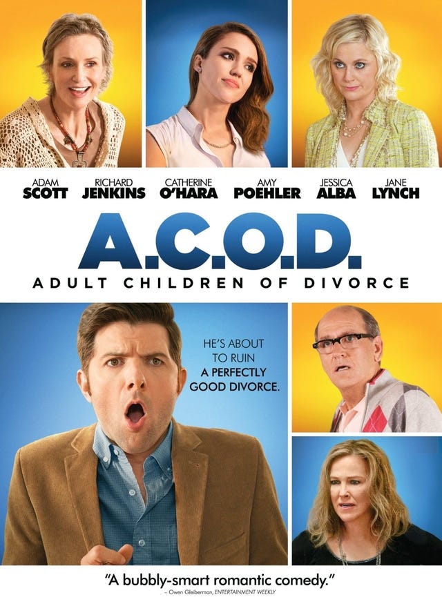 Parks and Recreation stars Adam Scott and Amy Poehler join an all-star roster in this hilarious divorce comedy -- A.C.O.D. stands for Adult Children of Divorce – that follows Scott's character, Carter, a successful and well-adjusted adult as he attempts to reunite his bitterly divorced parents (Richard Jenkins and Catherine O'Hara) for the sake of his younger brother's (Clark Duke) somewhat abrupt wedding plans. Despite having a solid relationship with his supportive girlfriend (Mary Elizabeth Winstead), Carter finds distraction in another woman (Jessica Alba) and the chaos of the whole situation threatens to derail his sanity. Poehler plays the young wife of Carter's father who is pretty much the same age as him, and Jane Lynch adds additional comic relief as a therapist who uses Carter's case as fodder for her books.