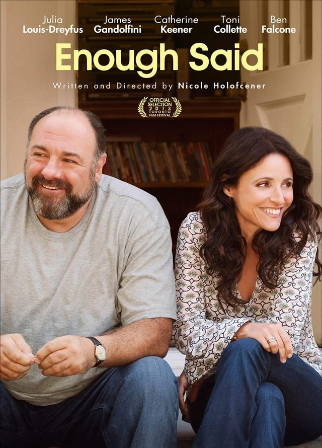 The late James Gandolfini is charming and lovable in this romantic comedy about empty nests and moving on in life. Starring opposite Julia Louis-Dreyfus, Enough Said casts the former The Sopranos star as Albert, who starts dating Julia's massage therapist, Eva, a single and divorced parent whose daughter is headed to college. Eva also unwittingly befriends Albert's ex-wife, Marianne (Catherine Keener), and slowly begins to learn all of his vices -- prompting her to doubt their relationship. Can Albert and Eva possibly make it work without having the past spoil the present? Also starring Toni Collette, Ben Falcone, Eve Hewson, Tavi Gevinson and Tracey Fairaway.