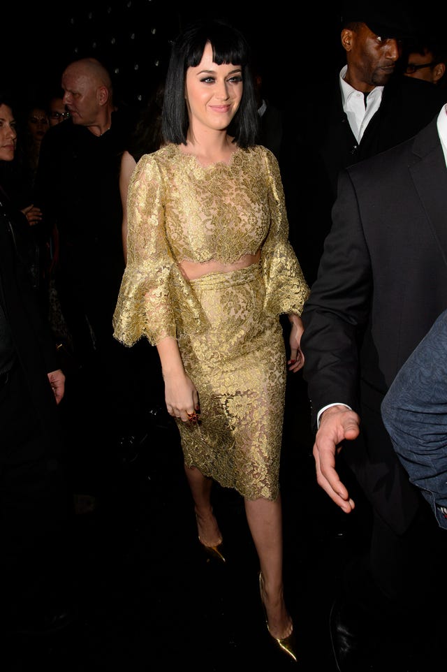 Is Katy Perry gorgeous in gold, or does this lacy ensemble make her look 80-years-old?