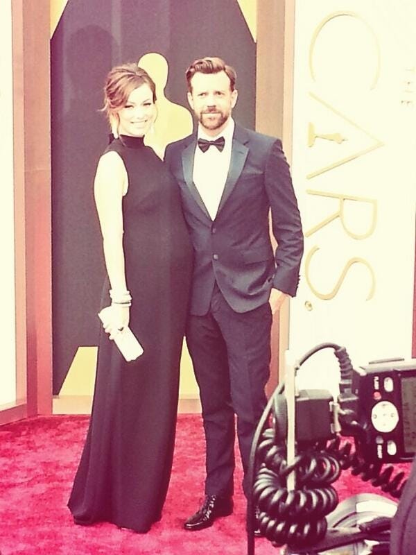 Parents-to-be Jason Sudeikis and Olivia Wilde hit the red carpet at the #Oscars. What do you think of Olivia's pregnancy look?