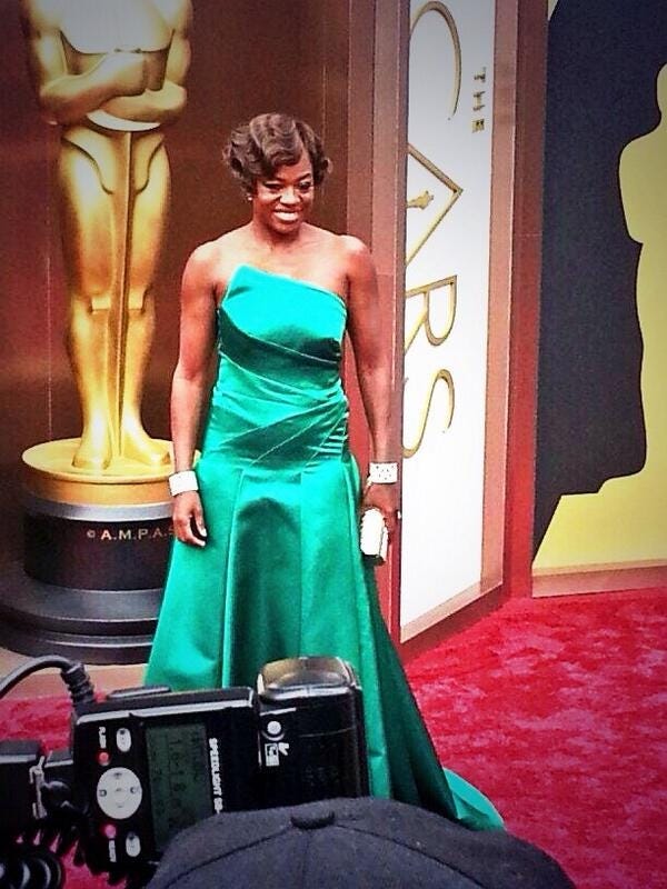 One of the first celebs to hit the Oscars red carpet is Viola Davis in vibrant green! How amazing does she look?