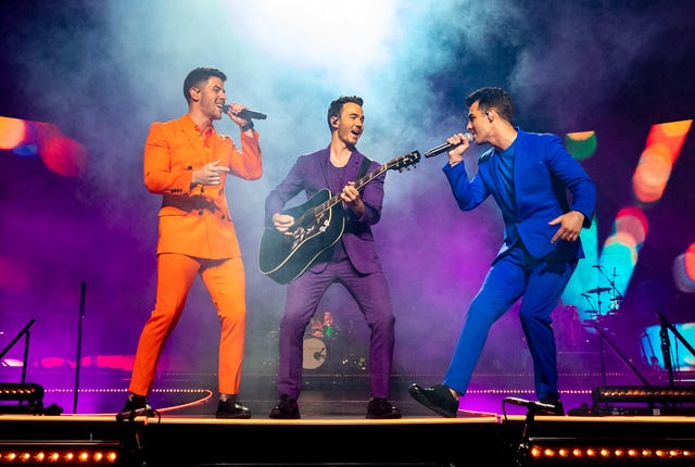 Colorful and coordinated! Nick, Kevin and Joe Jonas looked elated onstage during the first night of their Happiness Begins Tour at the American Airlines Arena in Miami on Aug. 7.