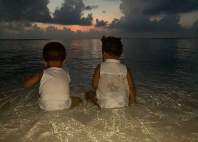 The "Drunk in Love" singer shared a slew of stunning snapshots on her personal website of an October 2019 trip India, where she performed at an enormous wedding. There were two new shots of daughter Rumi and son Sir in the bunch, including one snapped around sunset of the 1-year-old twins sitting in the shallow tidal waters of an idyllic beach. They faced away from the camera out toward the sea.