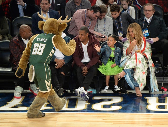 Hova and Bey brought daughter Blue Ivy along to the 2017 NBA All-Star Game in New Orleans. The 5-year-old sat in-between her parents, rocking a neon green dress and jean jacket. She appeared to be having a blast, eating Skittles and blue cotton candy while watching the game, and she also attracted the attention of several mascots at the Eastern vs. Western Conference game, including Pierre the Pelican, who brought her a little gift, and Bucky of the Milwaukee Bucks, whom she happily waved to.