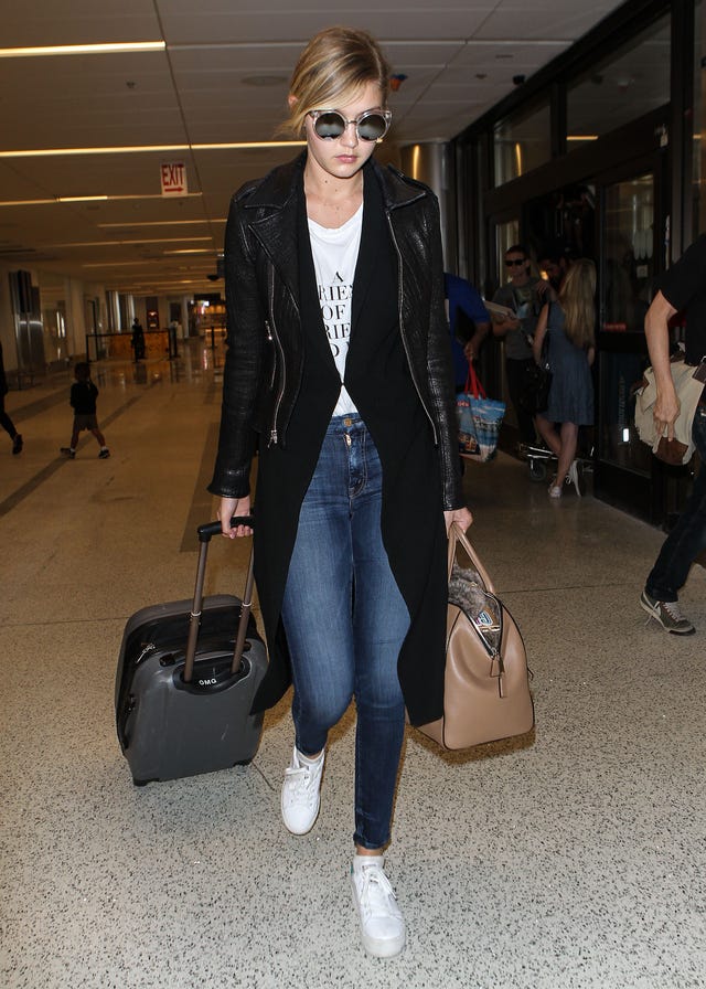 We're huge fans of Gigi's off-the-runway style, like this look from June 22 at LAX Airport. The 20-year-old cover girl was snapped in a long coat, blue jeans, sneakers and a rolling suitcase.