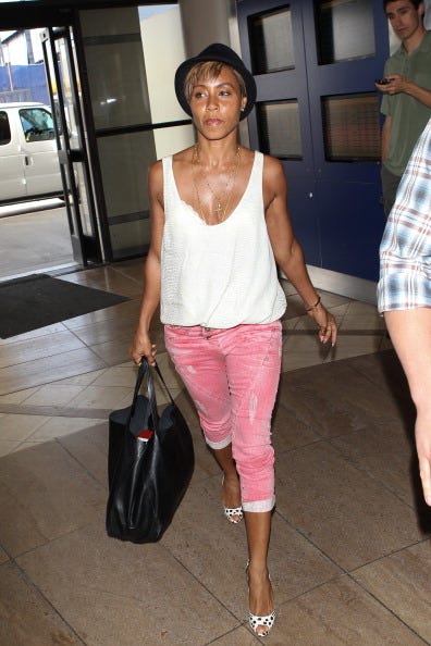 Jada paired a scoop-neck tank top with distressed denim, a fedora and a black tote bag, while snapped arriving at LAX.