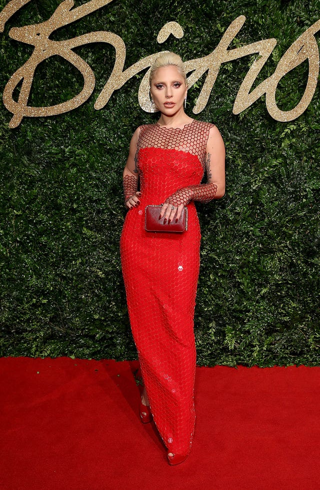 In a stunning red Tom Ford gown and Giuseppe Zanotti shoes, Gaga wowed across the pond while attending the British Fashion Awards 2015 at the London Coliseum on Nov. 23, 2015.