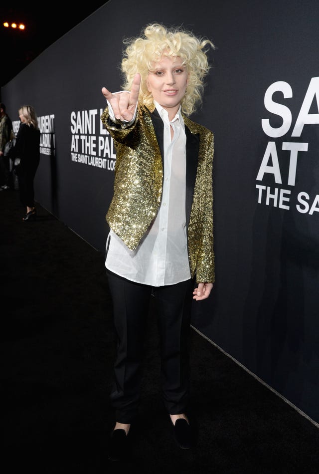 Sparkling in a gold jacket, Gaga and her blonde curls turned heads at the Saint Laurent runway show at the Palladium on Feb. 10, 2016, in Los Angeles, California.