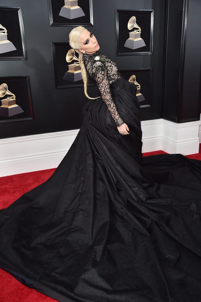 With a giant train requiring several handlers, Gaga wowed in this custom Armani Privé black lace gown at the 2018 GRAMMY Awards at Madison Square Garden in New York City on Jan. 28, 2018.