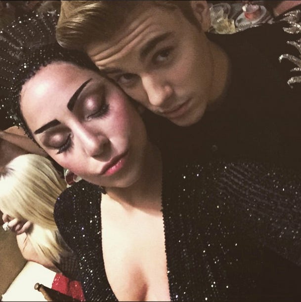 Allegedly the first to break the Gala's "no selfie" rule, the Biebs posted this pic with "the queen" Lady Gaga.