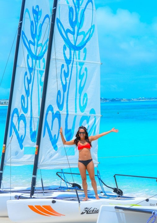The Fix star spent Mother's Day weekend with her mama (not pictured) at Beaches Turks & Caicos, where she rocked a red bikini top and navy blue bottoms during a catamaran cruise.