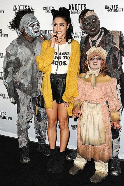 If her t-shirt speaks the truth, the High School Musical star was at Knott's Scary Farm "for the boos." Hudgens, who's a big fan of Halloween and has visited the theme park in Buena Park, California, for years, hung out with some spooky new friends on the black carpet on Oct. 1, 2015.