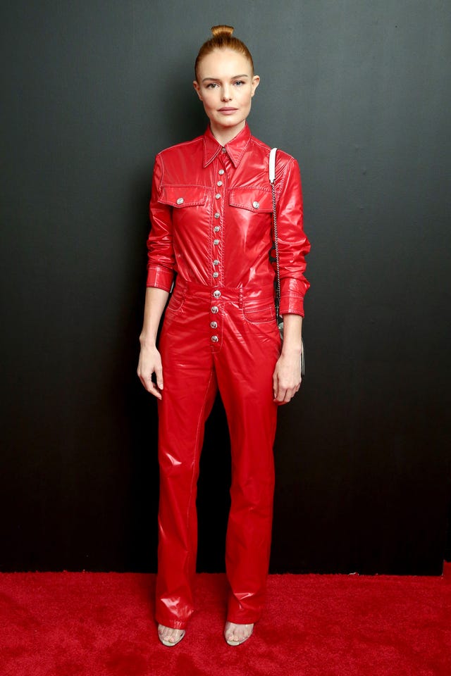 Red leather is often reserved for bikers or teenagers who want to make their parents angry, but we're all for this button-adorned long-sleeved jumpsuit that successfully turns that concept on its head. Bosworth chose the edgy look for the Calvin Klein Collection fashion show at the New York Stock Exchange during NYFW on Sept. 11.