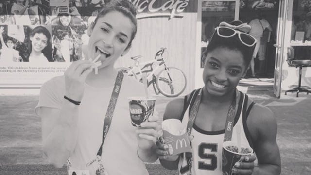 Raisman and Biles munched on the ultimate home-away-from-home comfort food on Aug. 17: McDonald's! Their treats? French fries and chocolate ice cream, naturally.