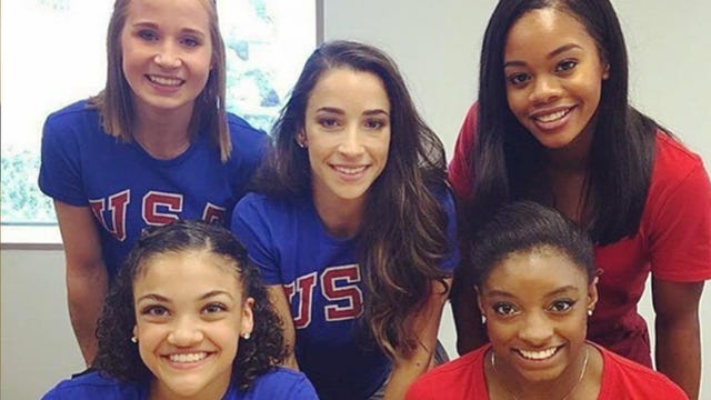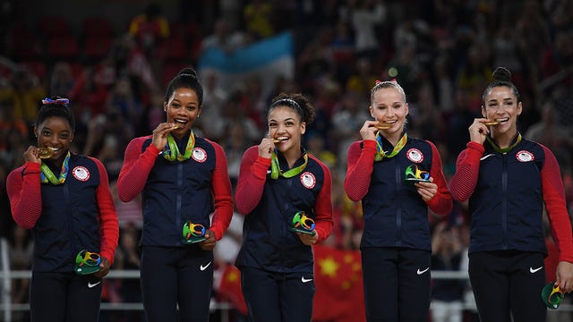 The Final Five celebrated their gold medal in the women's gymnastics team competition on Aug. 9.