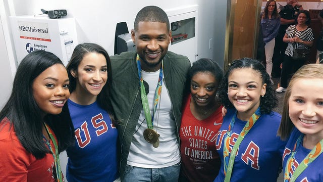 The Final Five shared the love with Usher, a huge fan of the gymnasts, when they both appeared on the Today show on Aug. 23. The R&B singer even tried on one of their gold medal’s, which Raisman joked was "NBD."