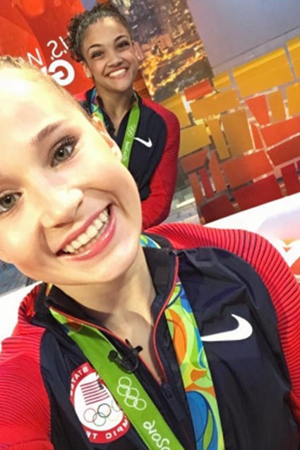 Raisman tried out a post-gymnastics career: makeup artist! "Testing out makeup options for @madison_kocian bar finals tomorrow!!" she captioned her Instagram post on Aug. 13. "So excited to cheer my girls on!!! @lauriehernandez_ and I will be the best cheerleaders in the stands!!!!"