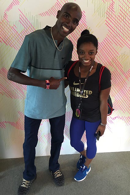 Biles was pretty excited to have "the pleasure of meeting the greatest, Mo Farah," on Aug. 20, admitting that "we fangirled over each other."